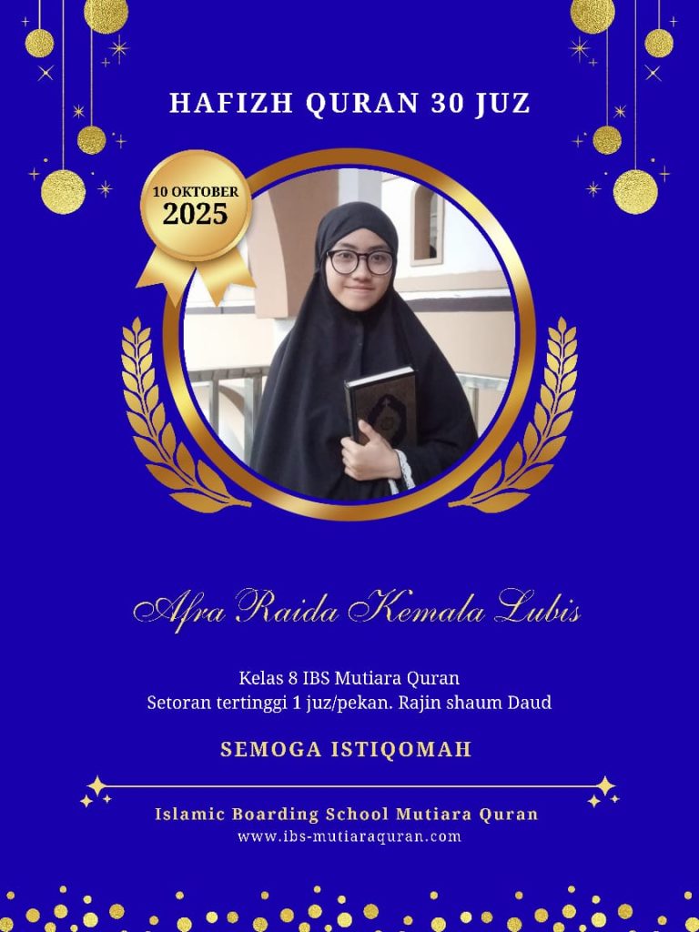 Afra Raida Kemala Lubis, santri kelas 8 IBS Mutiara Quran telah berhasil menyelesaikan setoran terakhir 30 Juz pada hari Kamis, 16 Oktober 2025 di Mesjid Nur Abdillah Anyer Banten Afra sudah terbiasa bangun malam dengan ibadah sholat Tahajjud setiap hari dan tilawah Al Quran. Ibadah menuju khatam hafalan Al Quran Selanjutnya…